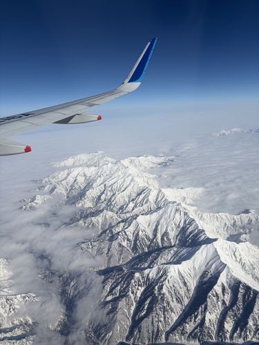 トイレに行くために席を立って途中で窓の外を見ると雪山が見えました。