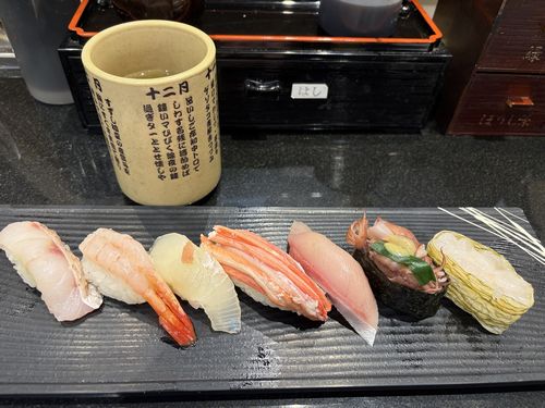 バスに乗って富山駅に着くと昼食時だったのでさっそくきときと市場とやマルシェの廻る富山湾すし玉富山駅店の列に並んでみました。