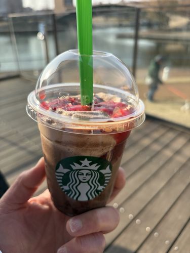 お店の外でも寒くなさそうだということでスターバックスでドリンクを飲んでまったりしようということで再びスターバックスに向かいました。店頭のポップに描いてあった新商品のカカオ&ストロベリームースフラペチーノを飲みました。お店の運河側にテラス席があってテーブルのある席は満席でしたが、側面側のテーブルの無い席は空きがあったのでそちらでゆったりと飲むことが出来ました。