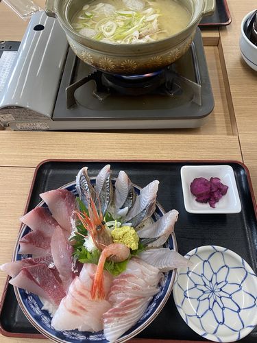 かみさんは氷見浜丼定食を注文してどちらにも土鍋漁師汁が付いていてテーブルの真ん中に二人分の土鍋汁が並びました。
