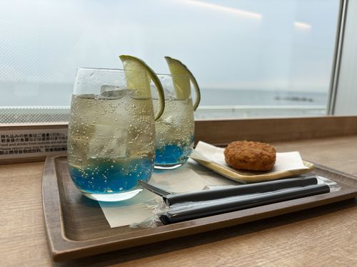 道の駅の2階がカフェになっていて海に面して座ることの出来るカウンター席があったので休むことにしました。メニューにサラトガクーラーがあったので2人ともこれにしました。あと白えびコロッケも頼んでシェアしました。