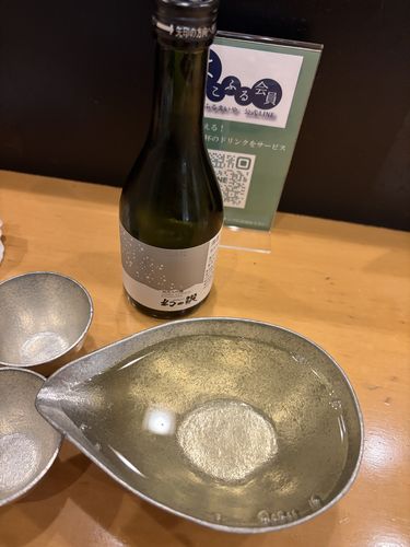 こちらのお店は日本酒の品揃えがたいへん充実していました。まずは若駒の辛口純米を頂きました。おちょこは錫製だそうです。