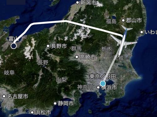 飛行機はほぼ定時に離陸しましたが、気流の乱れがありそれなりに揺れましたが、経路を見ると気流の乱れているせいか大きく北を廻って羽田に向かっていました。