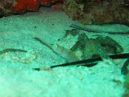 7:50にピックアップに来ますとのことたっだので7:40にロビーに降りたのですが、本当にジャスト7:50に迎えの車が来ました。そして早速ブルーコーラルのあるホワイトサンズに行きボートに乗り込みます。延々と30分ほどボートで移動して今日はナルスアンに潜ります。まずはヤマブキハゼです。しかしカメラのライトが光りません。というかライトのモードを変更しようとするとモードがくるくると回りまくります。