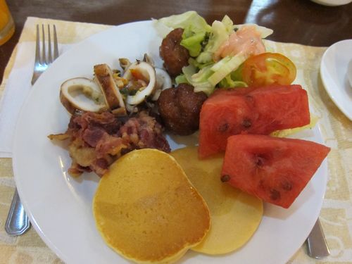 今日も朝食はホテルのレストランのビュッフェです。貧乏性なのでついつい料理を取りすぎます。