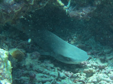 ダイビングが終わってシャワーを浴び新しい水着に着替えると、「ジンベエ~」と叫ぶ声が聞こえます。急いで後部デッキに集合です。先に 飛び込んだシャーミーのOKの合図を待って軽器材を着けてイクエーター号の後ろから飛び込みます。「下見て!」の声に下をよく見ると確かにジンベエです。 だんだん浮上してきます。