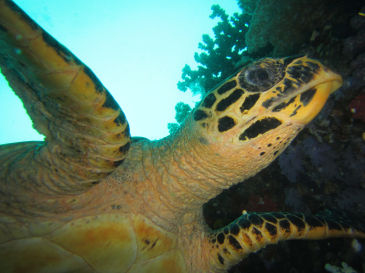 そしてなぜかウミシダを食べているタイマイがいました。カオリータ曰く「ウミシダ食べているカメは初めて見た。」とのことです。で、ウミシダですので当然張り付きます。自分でも気持ち悪いのかしきりに取ろうと手をもがいていましたが、当然取れるわけもなくウミシダを顔に張り付けたまま泳いで行きました。