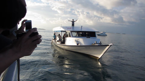 食事を終えてしばらくすると、もう器材もほとんど乾いていたので、パッキングをすませてしまうともうすることがありません。最後にシャワーを浴びて部屋を後にし、後はレストランで漫画を読んで過ごしました。会計をすませていよいよイクエーター号とさよならです。ドーニに乗り込むとあっという間に出発して、イクエーター号が遠ざかります。