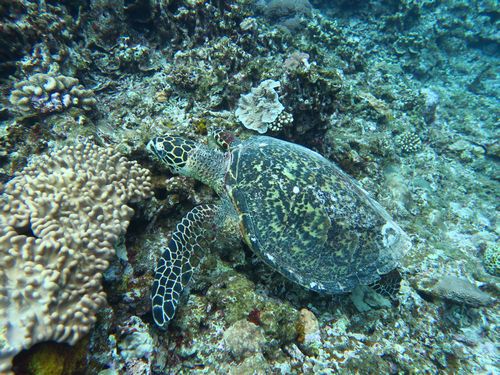 1本目のダイビングを終えて少し移動するとすぐに2本目のダイビングです。儀志布島カメ吉に潜ります。カメの見られるポイントとのことで、潜ってすぐにタイマイを見ることが出来ました。