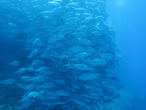 延々とボートに揺られて粟国島の筆ん崎に到着です。早速潜るとロウニンアジが表層を泳いでいます。