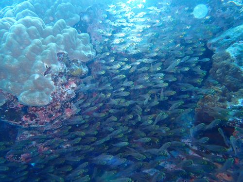 今度は山田ポイントに潜ります。昔来たときの山田ポイントは一面砂地でところどころに魚がいる感じでしたが今は植え付けられたサンゴが成長して魚がたくさん集まっていました。