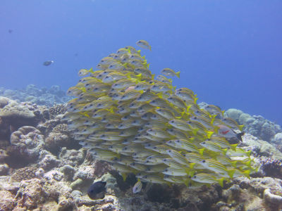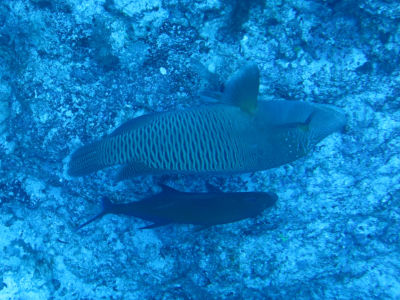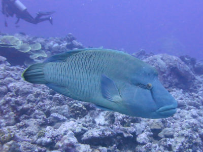 コクハンアラ?のような影とカスミアジアジ?を連れて泳ぐナポレオンなどを遠くに見ただけで、ほとんど成果なく1本目のダイビングを終えました。