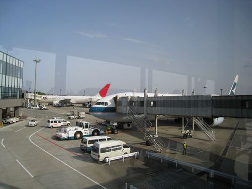 5時30発のバスに乗って順調に成田に到着して第2ターミナルへは6時45分着でした。てるみくらぶの窓口へと向かうとまだ開いていなくて数人が列を作っ て窓口が開くのを待っていました。さっそく僕らも列に並び、程なくすると窓口も開いてEチケットを受け取り今度はキャセイパシフィックの窓口へと向かいました。すぐに搭乗手続きは終了して時間は余裕だったのでスタバでお茶をしてから手荷物検査、出国審査を受けて搭乗です。