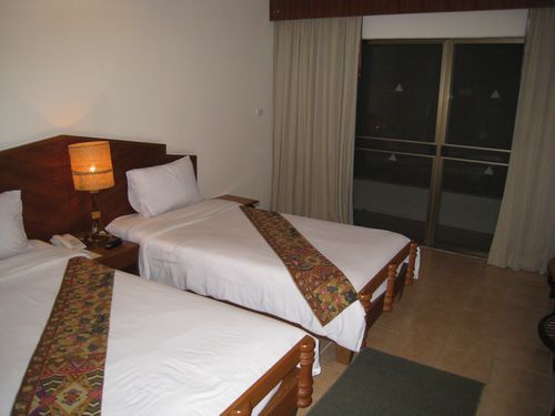 パトンビーチが近づくと夕方のラッシュなのか道路は渋滞していてパトンに着いたころにはすっかり暗くなっていました。宿泊先のパトンロッジホテルに付き チェックインを済ませると部屋へと案内されました。暗くてベランダの先はよく分かりませんが、部屋は広くてよさげです。